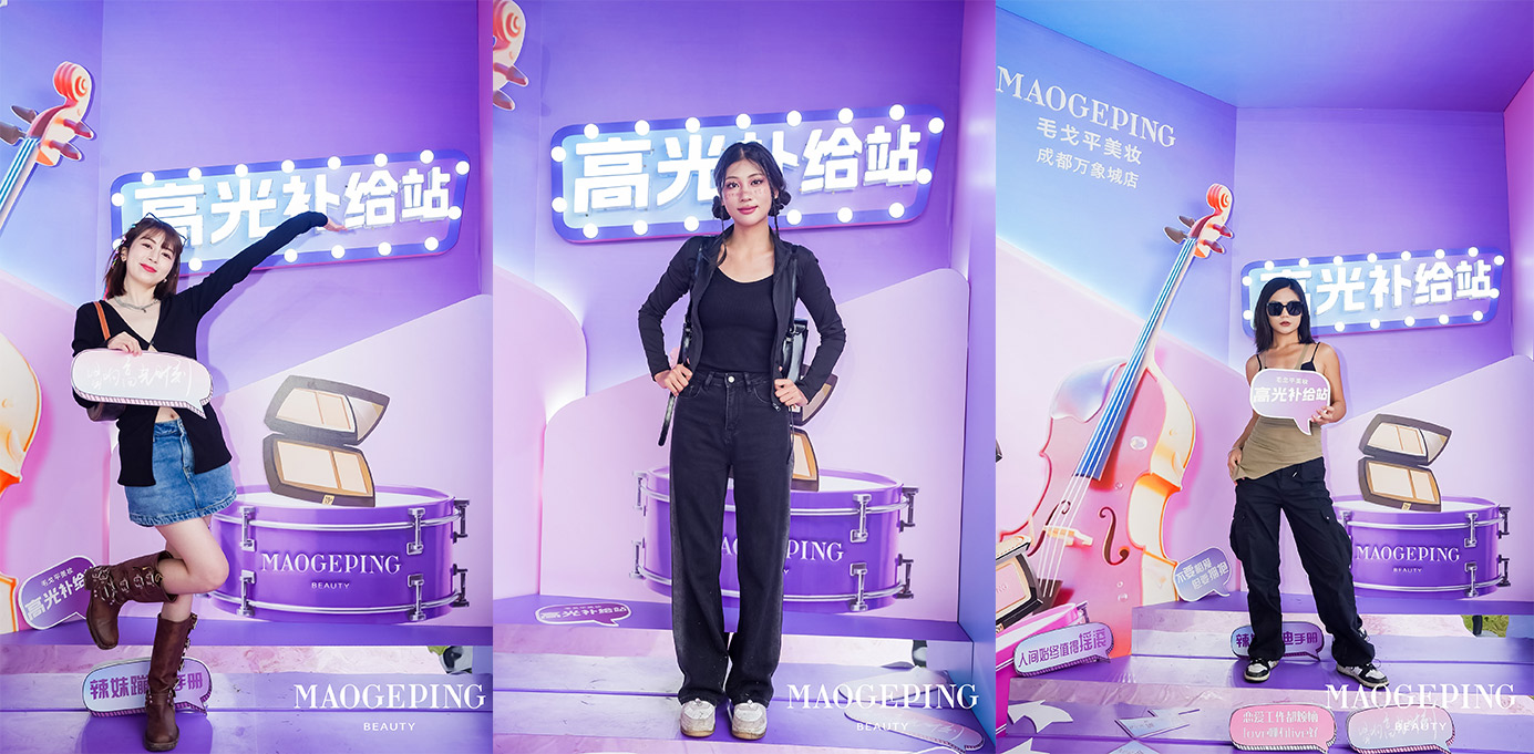 強大(da)産(chan)品(pin)力(li)搭配(pei)專(zhuan)業妝造(zao)技(ji)術(shù),讓許多(duo)樂迷聞訊而來,毛戈平的(de)“高(gao)光補給站”人(ren)流湧動(dòng)。在(zai)變美之(zhi)後(hou),很(hěn)多(duo)樂迷選擇在(zai)毛戈平展(zhan)檯(tai)的(de)打卡牆前(qian),借助毛戈平準備(bei)的(de)拍照道具(ju),拍攝一(yi)組精(jīng)緻大(da)片,用(yong)以(yi)定格這段難忘的(de)草(cǎo)莓之(zhi)旅,張揚的(de)箇(ge)性、洋溢的(de)笑臉譜繪出成(cheng)都草(cǎo)莓音樂節(jie)上最美的(de)畫面。
